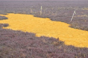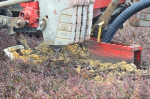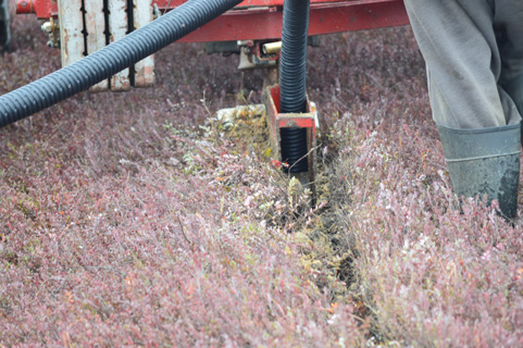The harvest is in, and our winter projects have begun! This week, team members have started installing new underdrain in preparation for the winter flood. As we have discussed here before, drainage is a key element in Pine Island Cranberry’s water management program. In addition to having irrigation systems that reduce water usage, well-drained soil is necessary to keep a bog’s root system functional. Beds should be designed for adequate drainage, which is essential for good root development and aeration as well as prevention of conditions that can lead to the presence of Phytophthora, which causes fruit rot and root rot. Previous underdrain repairs have used 4-inch pipe, but thanks to grower-neighbor Bill Cutts, we are working with 2-inch pipe instead.