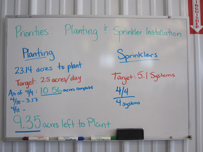 It’s easy to set targets, but you need to revisit and check outside influences. “You still have to plan for it,” Fred says. “Something always comes up. You don’t just say ‘oh well, we didn’t make it.’ You have to adapt.” Weather is always our biggest influence, but “mostly it works out,” he says. “The work doesn’t stop. You take advantage of the good days, and set targets knowing you’re going to need extra help sometimes.” Today, it was raining too hard to make planting possible, so some of the planting team is hard at work on sprinklers.