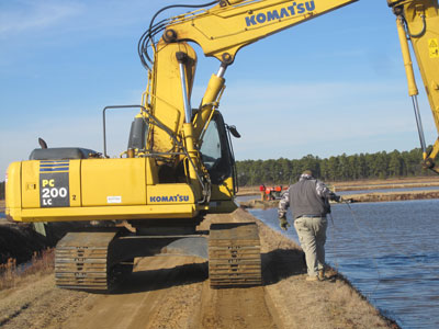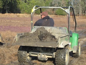 Mostly what he’s been doing is driving: he’s hauled sand to build up the dam at Ox Pasture, drove a Gator at Papoose hauling out dirt when the team was digging a new ditch, and has been driving for the sanding team since the end of December. He also helped install a gate and worked with Kylie’s team putting up swan string. “I’ve been having a lot of fun,” he says. “It is a change from the harvest; it’s still hard work but it’s not as hectic. It’s a little more predictable; you can be sure of what you’re doing on any given day.”